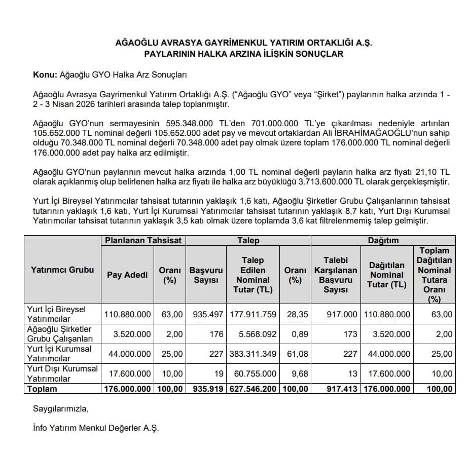 “Ağaoğlu Avrasya Gayrimenkul Yatırım Ortaklığı A.Ş. (“Ağaoğlu GYO” veya “Şirket”) paylarının halka arzında 1- 2 – 3 Nisan 2026 tarihleri arasında talep toplanmıştır. Ağaoğlu GYO’nun sermayesinin 595.348.000 TL’den 701.000.000 TL’ye çıkarılması nedeniyle artırılan 105.652.000 TL nominal değerli 105.652.000 adet pay ve mevcut ortaklardan Ali İBRAHİMAĞAOĞLU’nun sahip olduğu 70.348.000 TL nominal değerli 70.348.000 adet pay olmak üzere toplam 176.000.000 TL nominal değerli 176.000.000 adet pay halka arz edilmiştir. Ağaoğlu GYO’nun paylarının mevcut halka arzında 1,00 TL nominal değerli payların halka arz fiyatı 21,10 TL olarak açıklanmış olup belirlenen halka arz fiyatı ile halka arz büyüklüğü 3.713.600.000 TL olarak gerçekleşmiştir. Yurt İçi Bireysel Yatırımcılar tahsisat tutarının yaklaşık 1,6 katı, Ağaoğlu Şirketler Grubu Çalışanlarının tahsisat tutarının yaklaşık 1,6 katı, Yurt İçi Kurumsal Yatırımcılar tahsisat tutarının yaklaşık 8,7 katı, Yurt Dışı Kurumsal Yatırımcılar tahsisat tutarının yaklaşık 3,5 katı olmak üzere toplamda 3,6 kat filtrelenmemiş talep gelmiştir.”