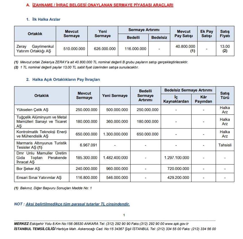 Kontrolmatik Teknoloji Enerji ve Mühendislik A.Ş. (KONTR), geçtiğimiz günlerde Şirketin 4.000.000.000 TL tutarındaki kayıtlı sermaye tavanı dahilinde olmak üzere, şirketin 650.000.000 TL olan çıkarılmış sermayesinin; %100 oranında nakden (bedelli) karşılanmak suretiyle 650.000.000 TL artırılarak 1.300.000.000 TL’ye çıkarılmasına, artırılan 650.000.000 TL tutarındaki sermayeyi temsil eden 650.000.000 adet payın tamamının 1,00 TL nominal bedelli nama yazılı pay olarak ihraç edilmesine, 650.000.000TL tutarındaki bedelli sermaye artışı kapsamında pay sahiplerinin yeni pay alma haklarında herhangi bir kısıtlama yapılmamasına ve pay sahiplerine yeni pay alma haklarının 1 TL nominal değerli her bir pay için 1 TL fiyattan nominal değer üzerinden kullandırılmasına karar vermiş ve SPK başvurusunu yapmıştı. Bugün yayımlanan SPK bülteninde Kontrolmatik’in başvurusuna onay verildi. Şirket kısa süre içinde sermaye artırımı süreçlerine ilişkin açıklama yapacak.