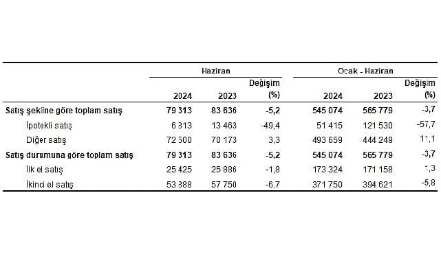 Türkiye genelinde ikinci el konut satışları Haziran ayında bir önceki yılın aynı ayına göre %6,7 azalış göstererek 53 bin 888 oldu. Toplam konut satışları içinde ikinci el konut satışının payı %67,9 oldu. İkinci el konut satışları Ocak-Haziran döneminde ise bir önceki yılın aynı dönemine göre %5,8 azalışla 371 bin 750 olarak gerçekleşti.